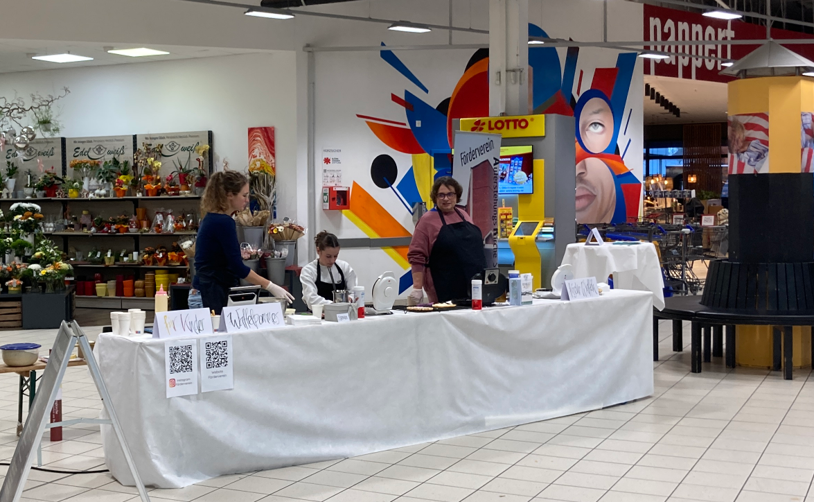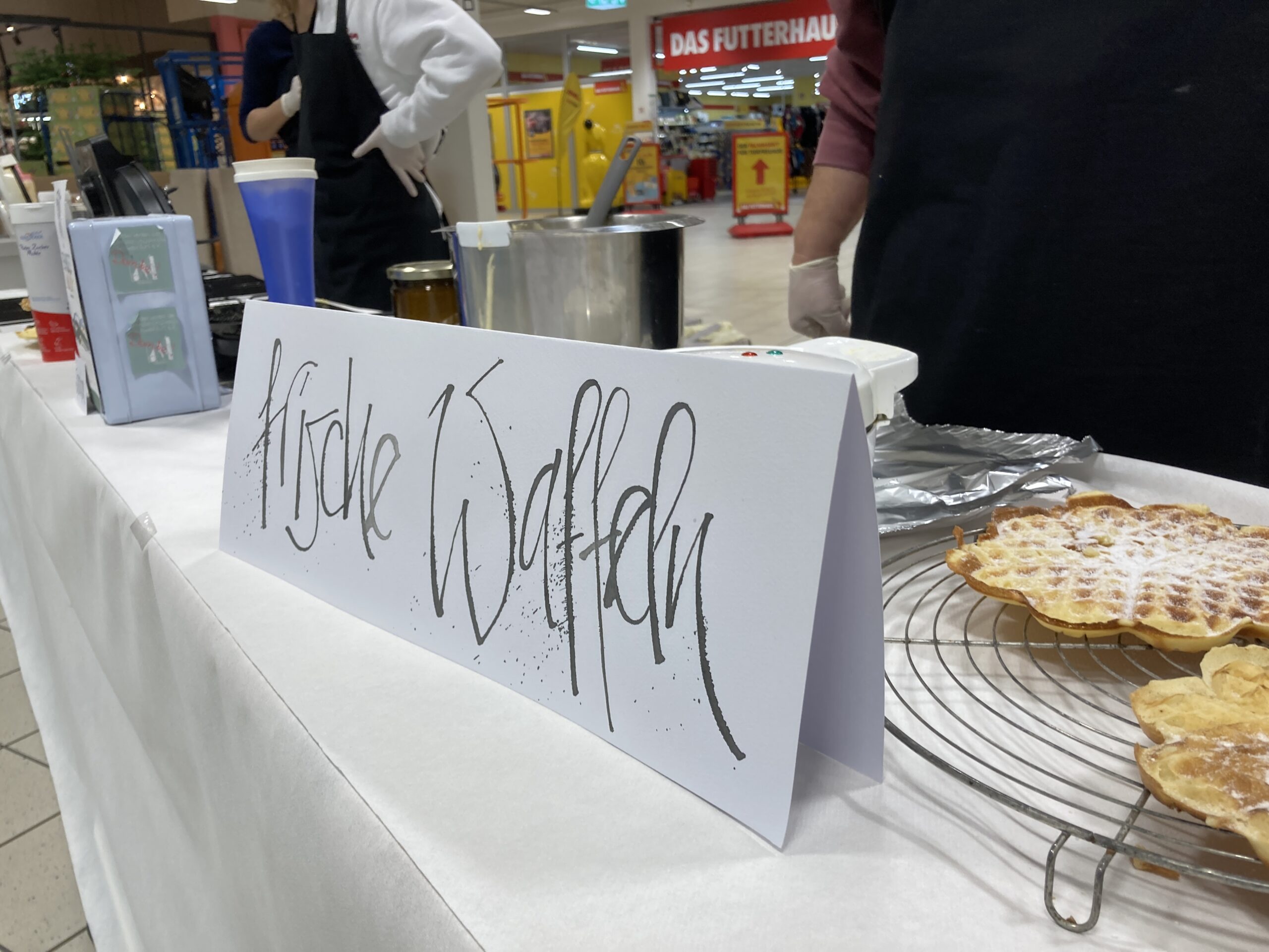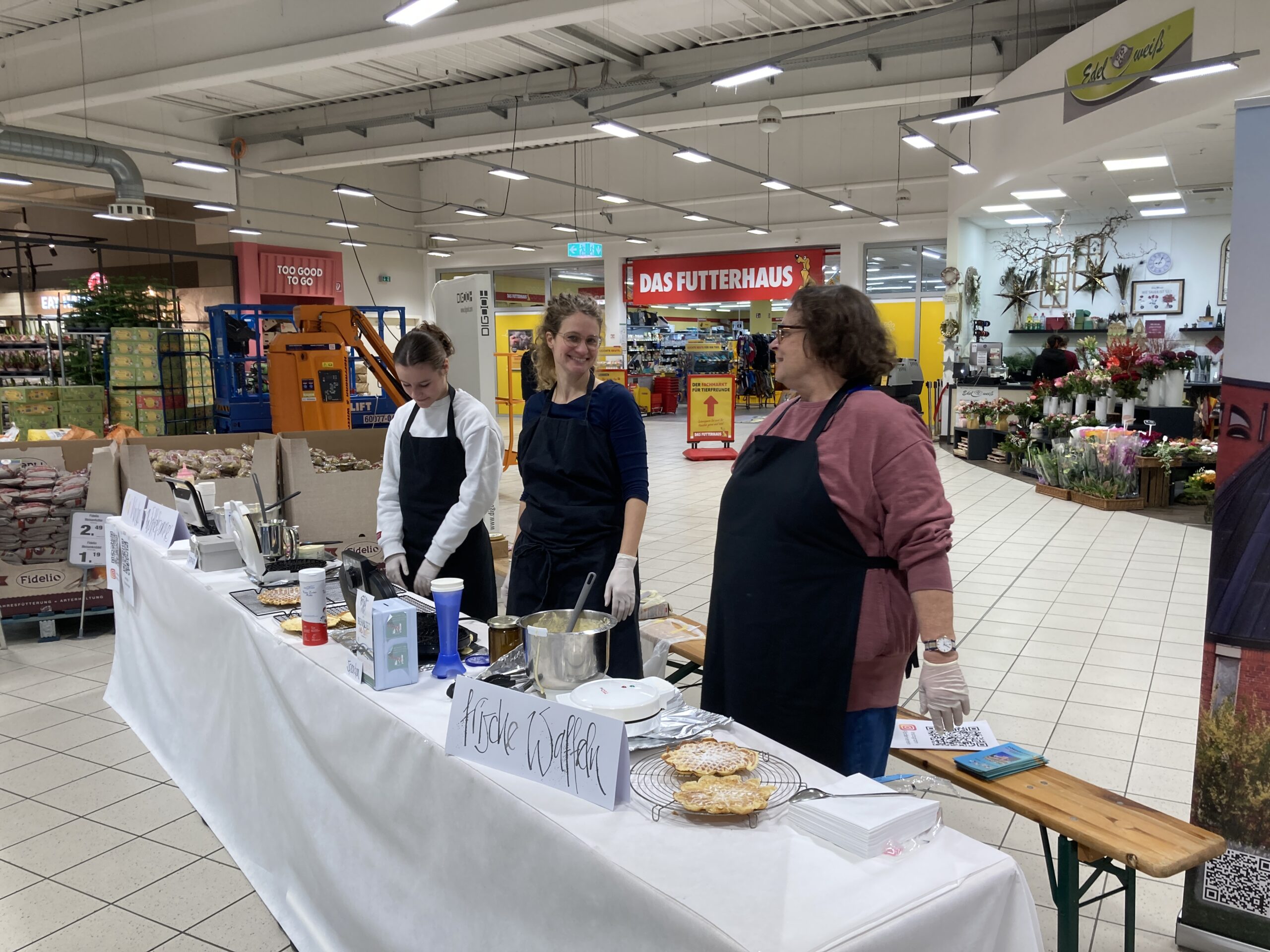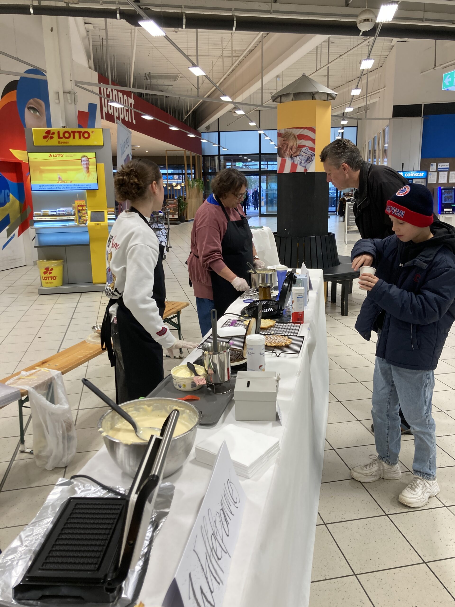 Der Höchner am Bergl (E-Center) war so freundlich, uns einen Stand im Eingangsbereich bei den Kassen zur Verfügung zu stellen. Nachdem wir zwei Tische und vier Waffeleisen aufgebaut hatten, konnte es losgehen. Nach anfänglichem Beschnuppern wurde unser Stand sehr gut angenommen: Eine Waffel vor dem Einkauf, eine Waffel nach dem Einkauf oder auch Waffelpommes für die Kinder – alles fand großen Anklang.